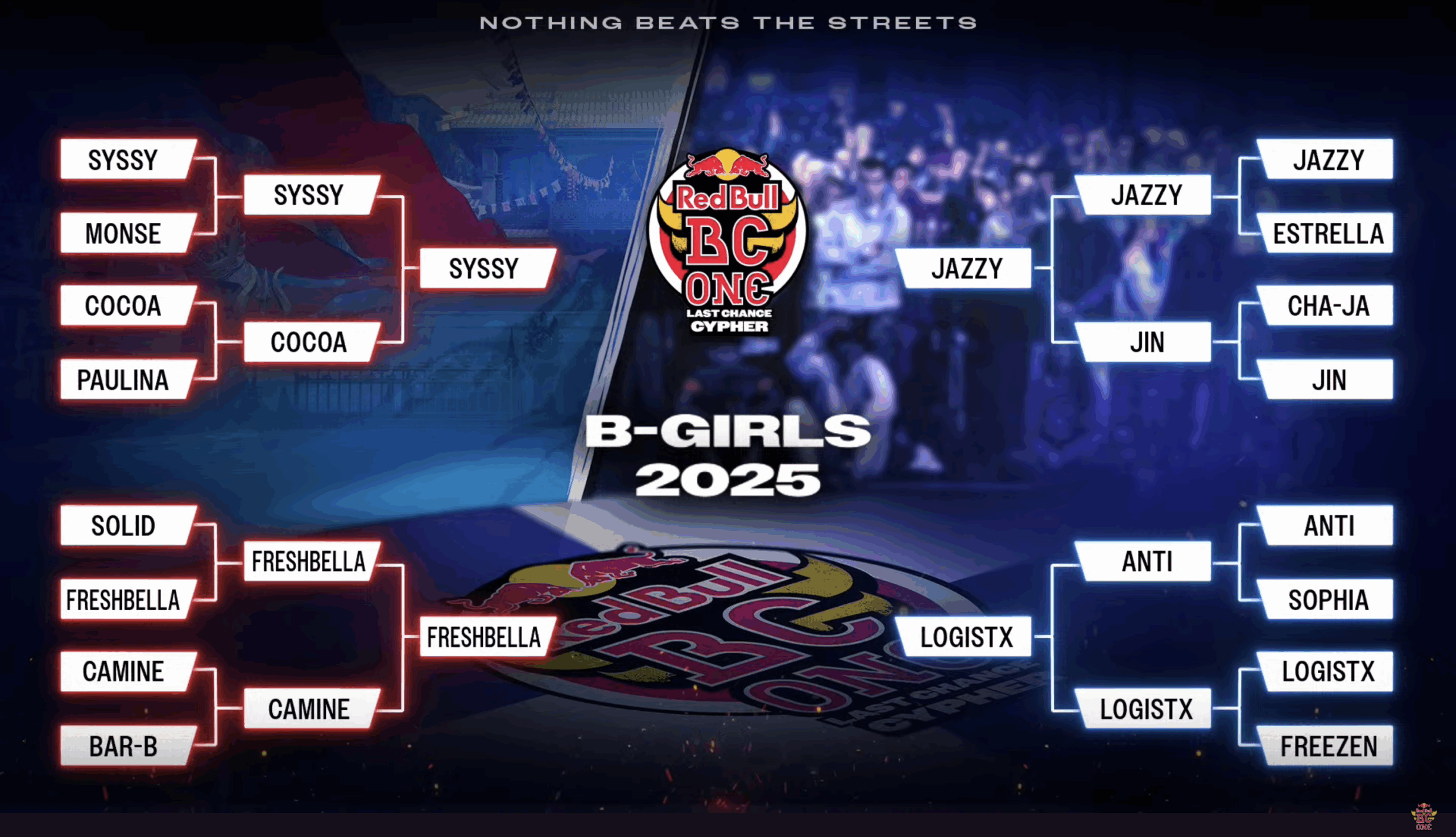 - BGirlの結果、Top4進出はSyssy、Jazzy、Freshbella、Logistx
